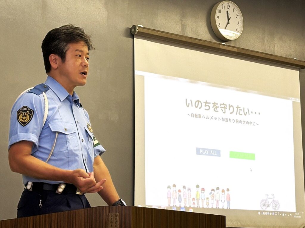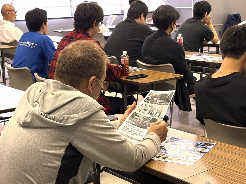 令和8年4月1日より道路交通法の改正が施行され、自転車の交通違反に交通反則通告制度が適用される事から、内容について詳しくご説明を頂きましたほか、昨年に比べて路上寝込みの交通死亡事故が激増している事から、深夜帯の路上やトラックの死角など予想だにしていない事故への危険性を注意する旨を教材と共に詳しくご講義をいただきました。